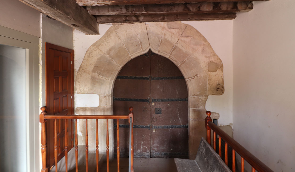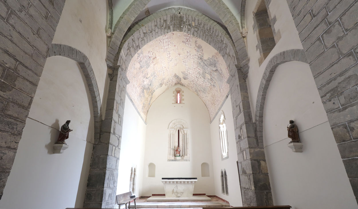 El acceso al templo se realiza a través de una portada gótica, claramente posterior a la mayor parte del edificio. La iglesia cuenta con una sola nave que se cubre con una buena bóveda de cañón apuntada. Lo más interesante, tal vez, sea la amplia bóveda de crucería que se eleva en la parte central de la nave, inmediatamente después del presbiterio. Se compone de unos gruesos arcos que culminan en una clave en forma de flor, flanqueados por dos sólidos arcos fajones. Los arcos formeros de los muros norte y sur se apoyan sobre unas ménsulas en las que vemos de nuevo los bustos de damas y, esta vez también, de nobles, que con sus manos simulan sostener el peso de los nervios.