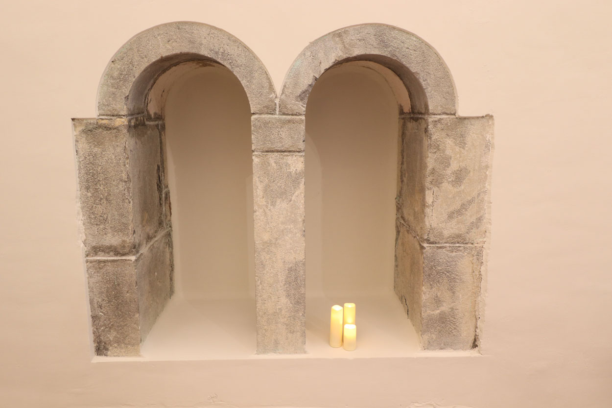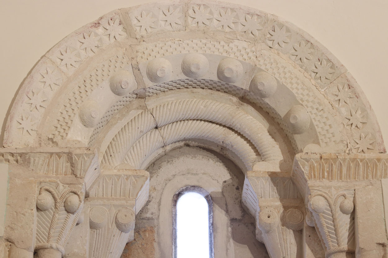 Pero quizá lo más notable del exterior de esta iglesia, desde un punto de vista escultórico, sea su ventanal románico. Se trata de un gran vano compuesto por tres arquivoltas ricamente decoradas con motivos vegetales y un elegante sobrearco esculpido con el característico ajedrezado jaqués. Este mismo recurso lo vemos también en los cimacios que se apoyan sobre los capiteles. Con respecto a estos, los más interesantes sin duda alguna son los que se encuentran más hacia el exterior. En ellos vemos los rostros de dos mujeres con el tocado y el barbuquejo a la moda de los siglos XII-XIII. El de la izquierda, pese a su esquematismo, muestra una faz joven, mientras que el de la derecha parece casi el retrato de una mujer de edad avanzada. Dos magníficos ejemplos de cómo querían ser vistas las comitentes de estos edificios.