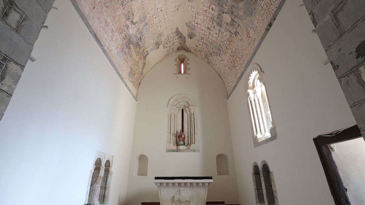 La fortuna ha hecho que la iglesia haya pasado a manos del concejo de Miñano Menor en el año 2022, permitiendo la puesta en marcha de unas campañas de restauración (impulsadas por la empresa Ártyco con el apoyo del Servicio de Restauración de la Diputación Foral de Álava) que han sacado a la luz tanto las pinturas de la bóveda del presbiterio como aquellas que decoran la bóveda de crucería. Las pinturas del presbiterio presentan una cuadrícula formada por sillares en la que cada una de las piezas ha sido decorada con un motivo distinto. En este insólito casillero podemos ver cruces flordelisadas, escudos, leones rampantes, castillos, flores de lis, rostros, árboles, formas vegetales, estrellas, figuras geométricas, caprichos formales de difícil identificación, etc.