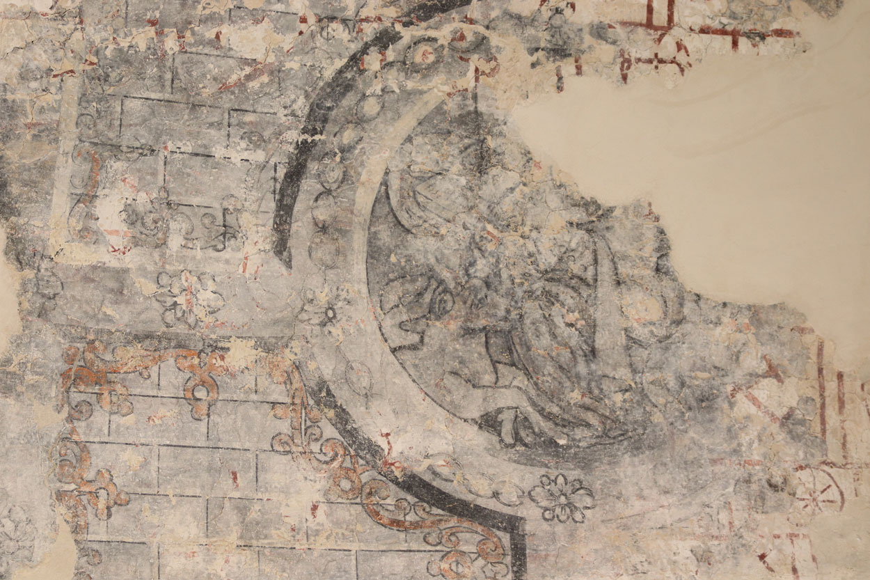 La mayor parte de las pinturas que hoy en día son visibles se realizaron empleando pigmentos ocres sobre una fina lechada de cal. Posteriormente, en el siglo XVI, todas las bóvedas se pincelaron con una capa de gran riqueza de la que destacan unos tondos con las figuras de los evangelistas.
