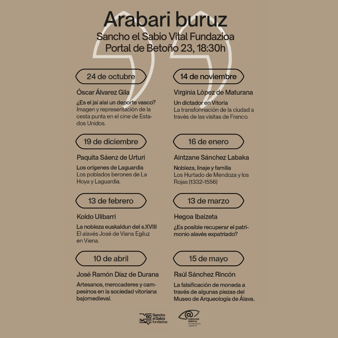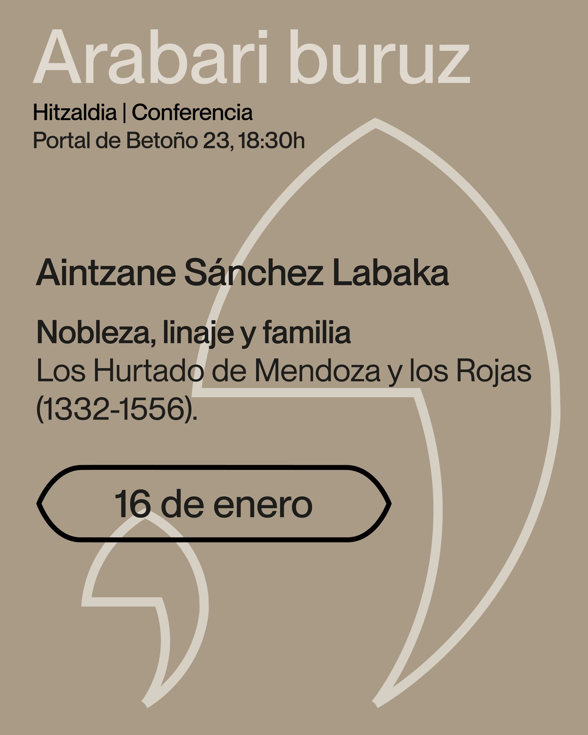 Seguimos en este 2025 con el ciclo de conferencias Arabari Buruz, que tiene lugar en la Fundación Sancho el Sabio. En esta ocasión nos adentraremos de la mano de la historiadora Aintzane Sánchez Labaka en las estrategias internas que llevaron a cabo los linajes de los Hurtado de Mendoza y los Rojas (situados en Montaña Alavesa) durante el final de la Edad Media. En esta conferencia, titulada «Nobleza, linaje y familia. Los Hurtado de Mendoza y los Rojas (1332-1556)» se ahondará en el funcionamiento interno de la nobleza alavesa, poniendo especial atención en la onomástica y las estrategias matrimoniales llevadas a cabo por los diferentes miembros de los linajes. Esto permitirá no solo conocer con mayor profundidad las dinámicas sociales de finales de la Edad Media, sino también la influencia política de las decisiones familiares. La entrada es libre hasta completar aforo. ¡Os esperamos!