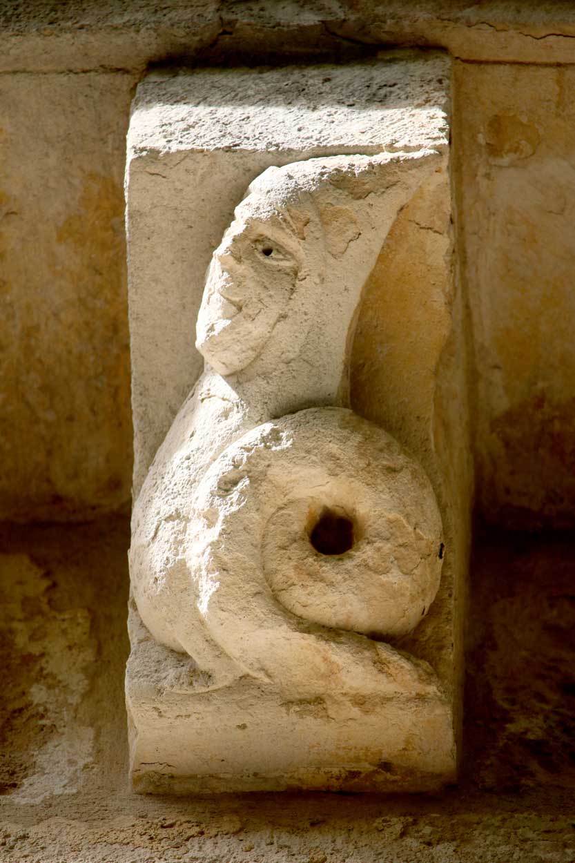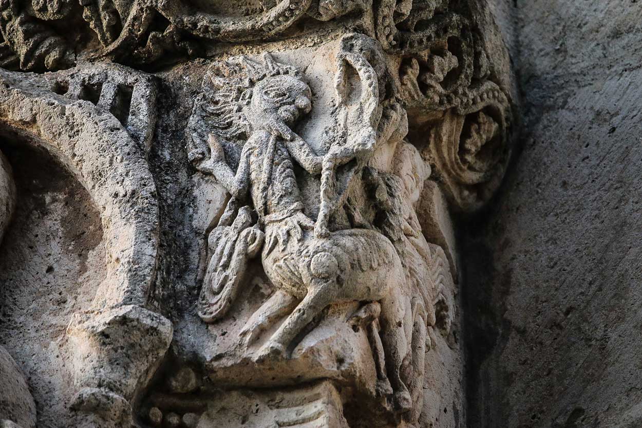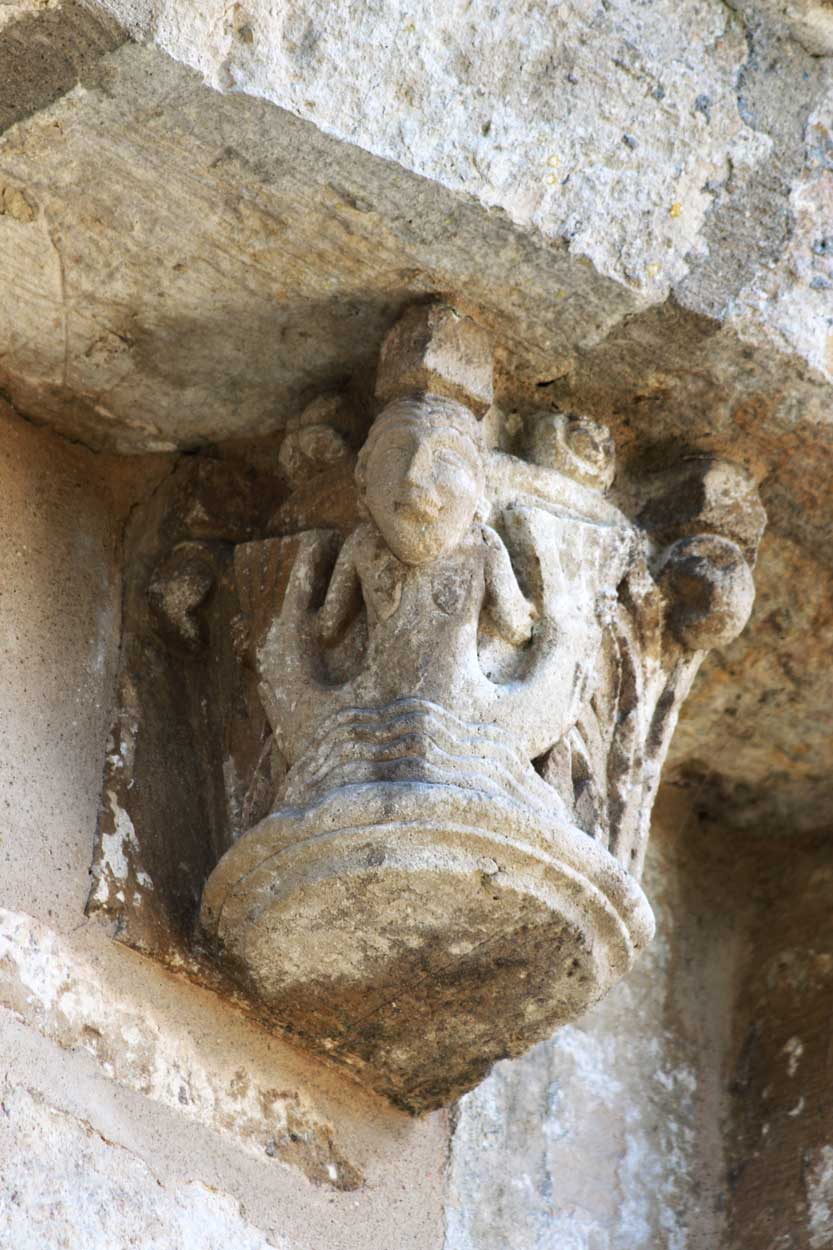 En el interior encontramos dos tipos de capiteles: vegetales y figurativos. Los capiteles de temática vegetal se concentran en el crucero, en la zona de la nave. Dos de ellos tienen un diseño similar a base de hojas y flores de lis en las esquinas, mientras que los otros dos ofrecen filigranas de gran calidad escultórica, con rostros y animales escondidos entre los ramajes.