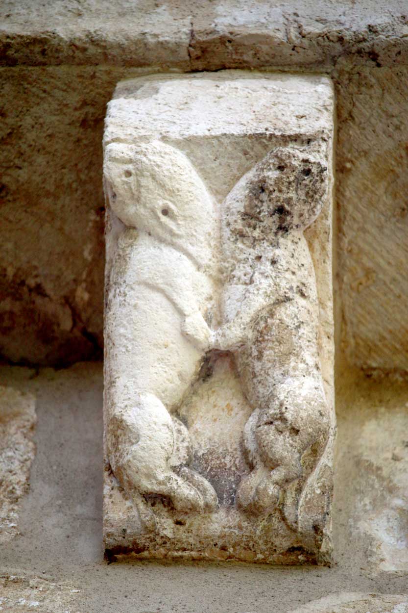 En la zona del presbiterio encontramos otros cuatro capiteles, esta vez de temática figurativa. En el primero se nos narra el Pecado Original, momento en el que Adán y Eva comen del fruto prohibido y, al hacerlo, sienten vergüenza de su desnudez. Desde lo alto Dios Padre descubre que han incumplido su mandato. En el capitel de al lado se muestra la expulsión del Paraíso y cómo un ángel con espada señala la puerta de salida y les empuja para obligarles a abandonar el lugar. En otro capitel se nos muestran, además, otros pecados cometidos por la humanidad, como el pecado de la avaricia, representado por un hombre de cuyo cuello cuelga un saco de monedas, que está siendo torturado por un demonio. A su lado vemos el castigo a la lujuria femenina, representada por una mujer desnuda de cuyos pechos cuelgan una rana y una serpiente.