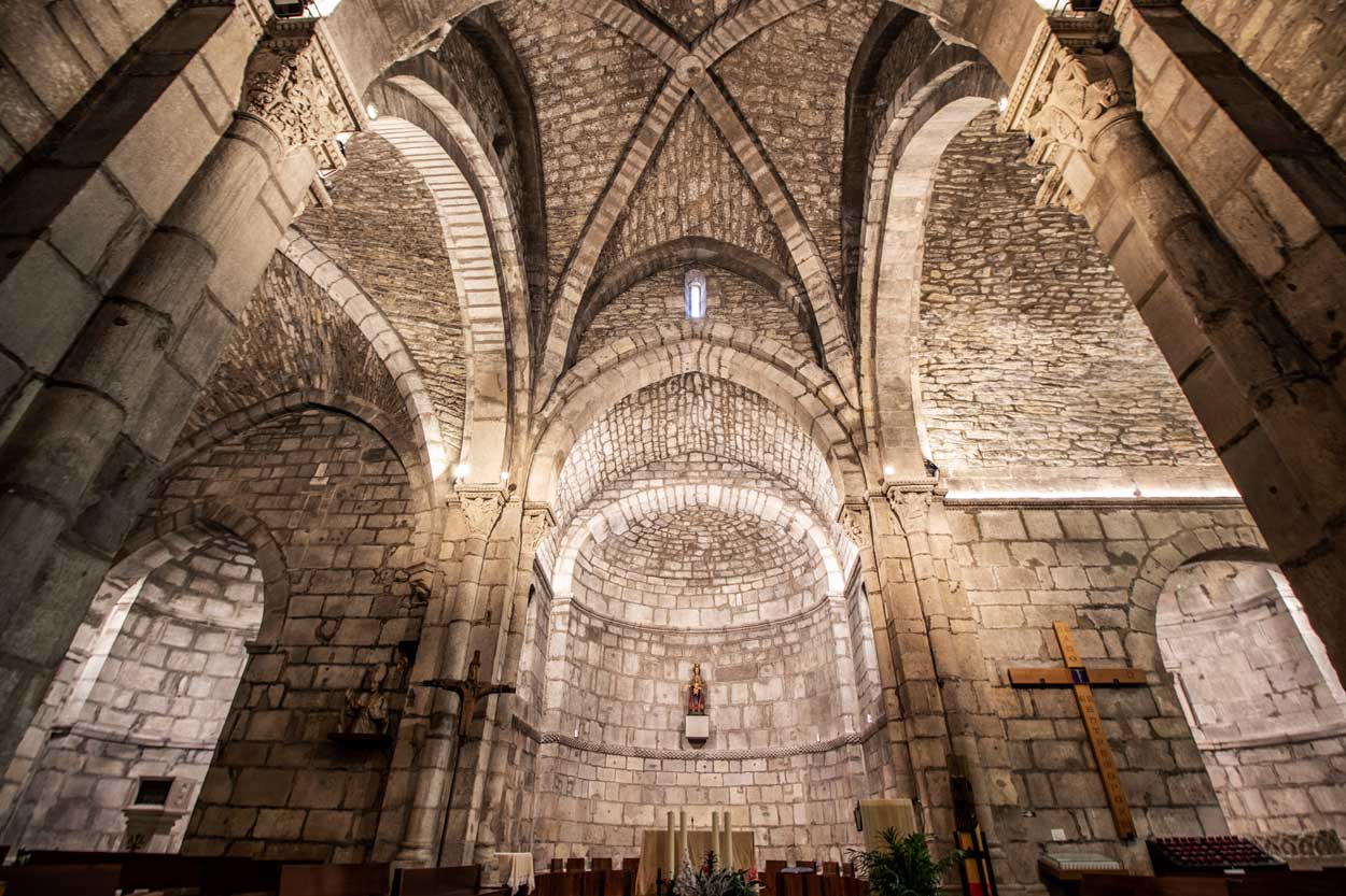 El interior de la iglesia, con la piedra desnuda tras las últimas restauraciones que retiraron los revoques, nos recibe con una sola nave longitudinal que culmina en un amplio crucero. Éste está cubierto con soluciones distintas: una bóveda de crucería en el norte y una bóveda de cañón apuntado en el sur. Es en la cabecera de la iglesia donde se concentra la mejor decoración escultórica, de marcado sabor borgoñón.